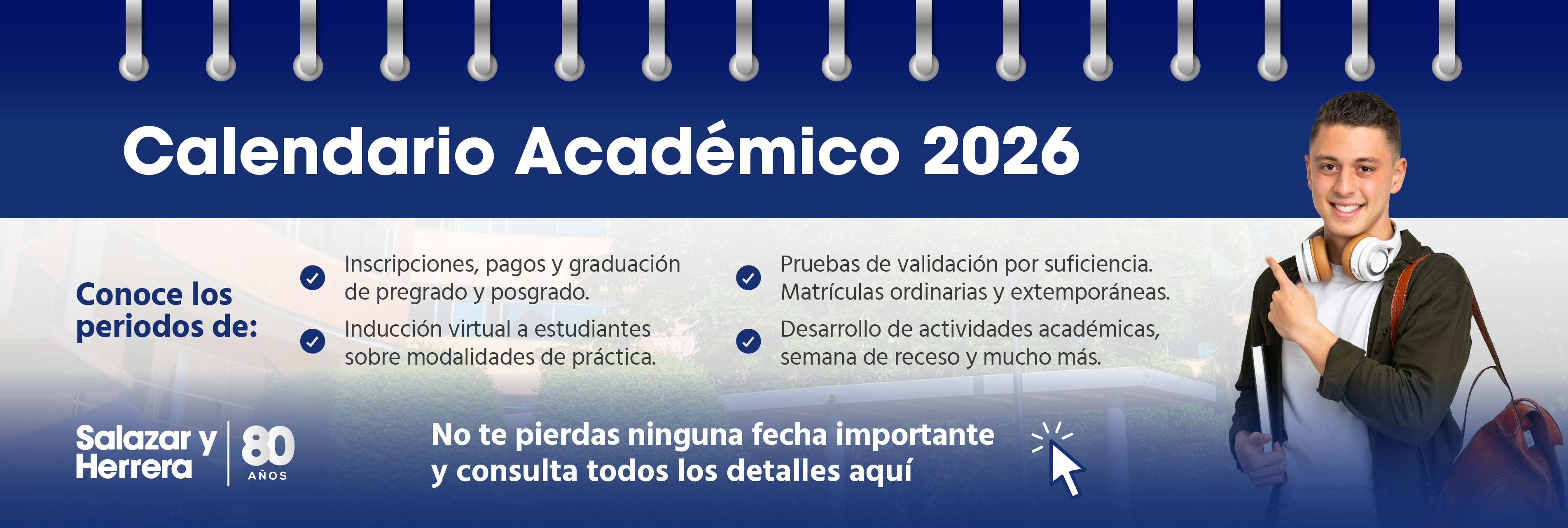 La Institución Universitaria Salazar y Herrera presenta su Calendario Académico 2026, un recurso fundamental para que estudiantes, docentes y colaboradores planifiquen de manera organizada las actividades del nuevo año académico.